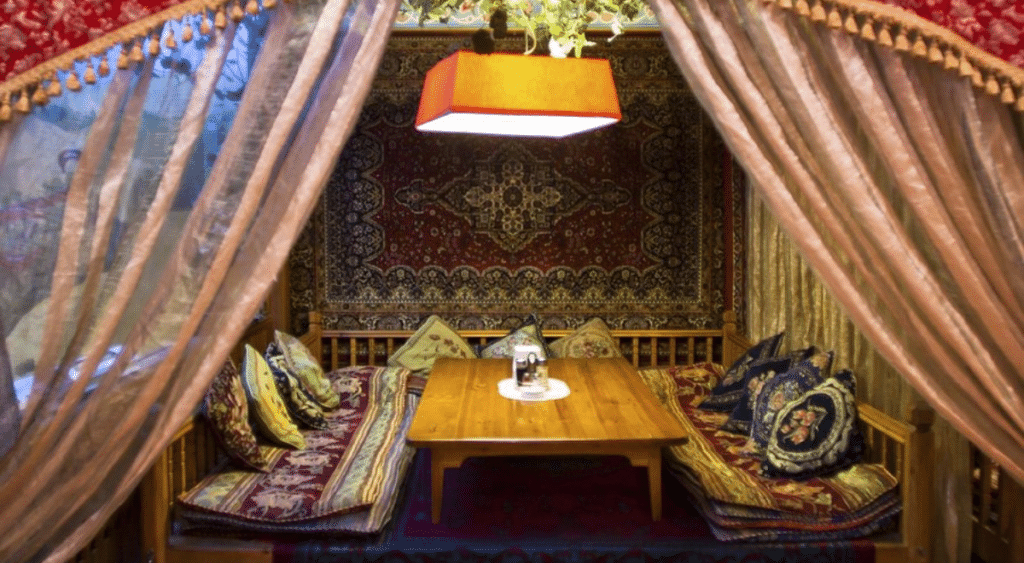The ambiance is supported by wooden elements, carpets, and decorations. In the evening you can enjoy live performances by bands from Almaty.