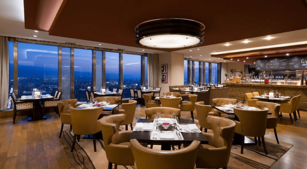 At the same time, you can enjoy a fine-dining cuisine, that offers you European dishes, fresh sushi, or American Prime steaks. The restaurant extends over two floors, is modernly furnished, and the live music program ensures the cozy atmosphere.