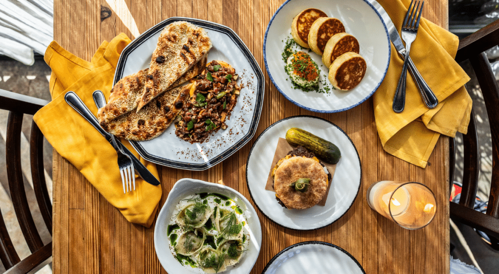 For example, the menu features cheeseburgers, delicious desserts, and the special Nancy Cake. This is a small cake made of cultured butter, accompanied by smoked trout roe.